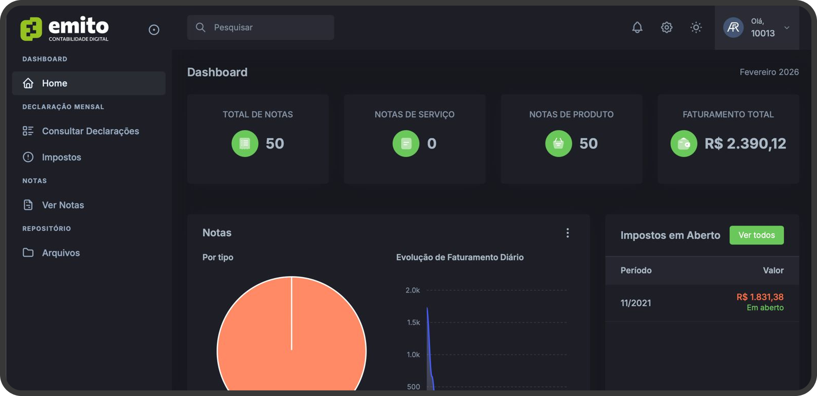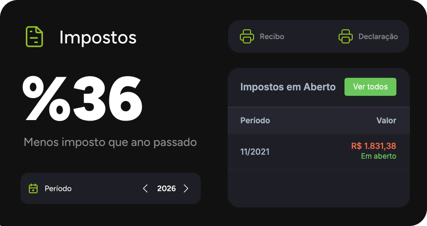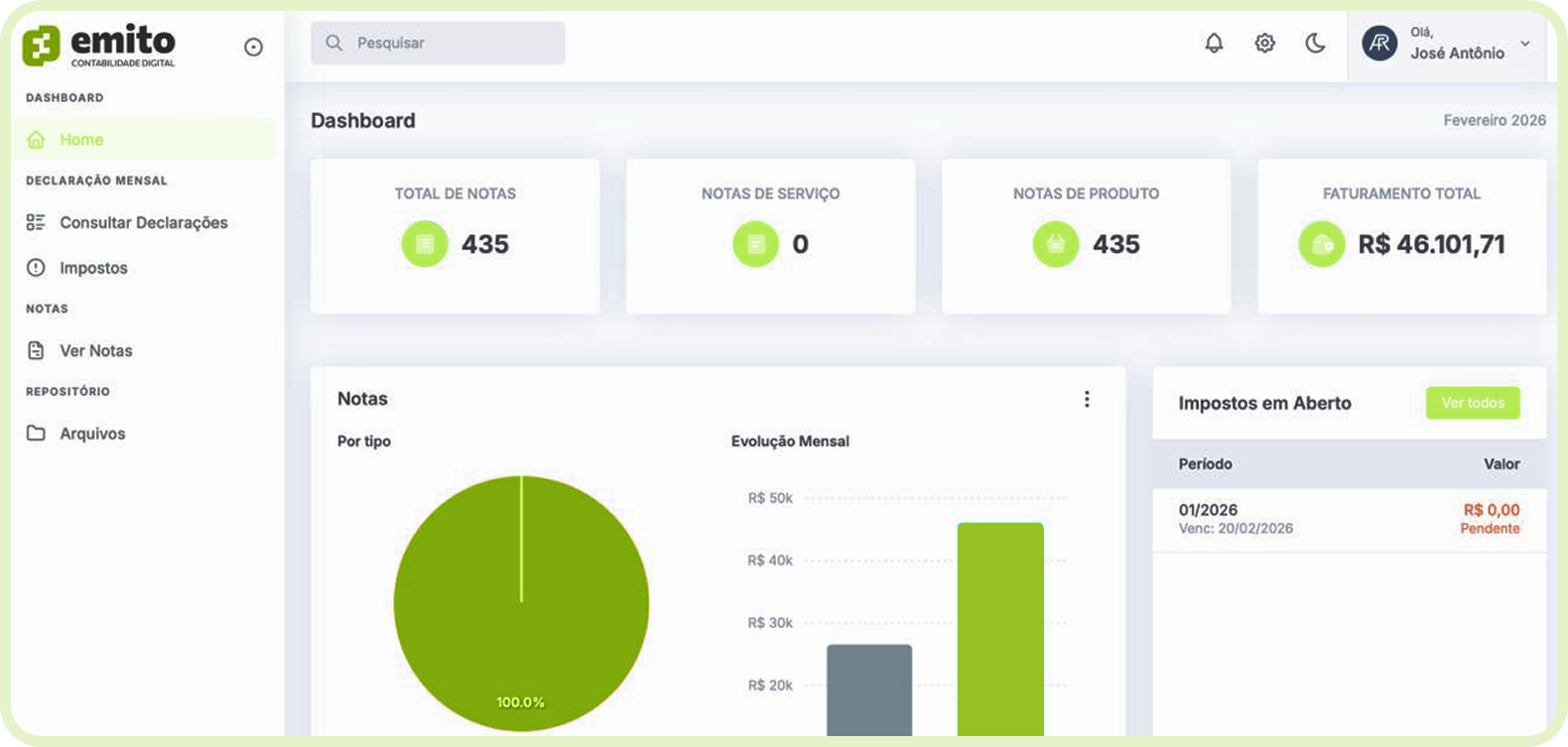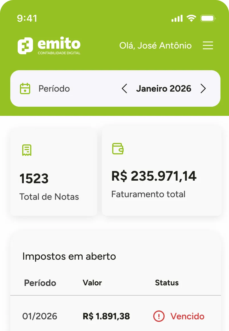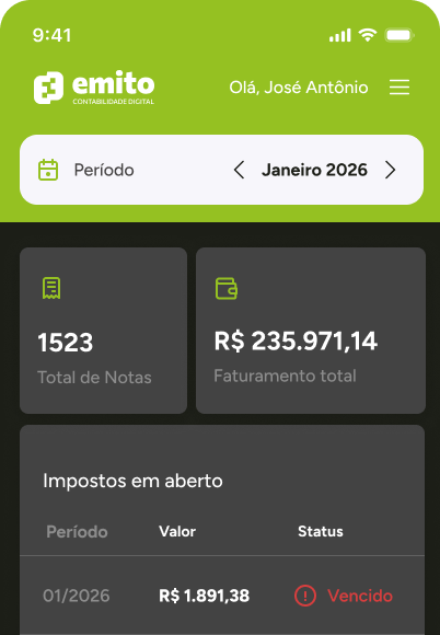 Veja seu faturamento mensal, total de notas emitidas e impostos em aberto, tudo atualizado automaticamente no seu painel, sem precisar entrar em nenhum portal externo.